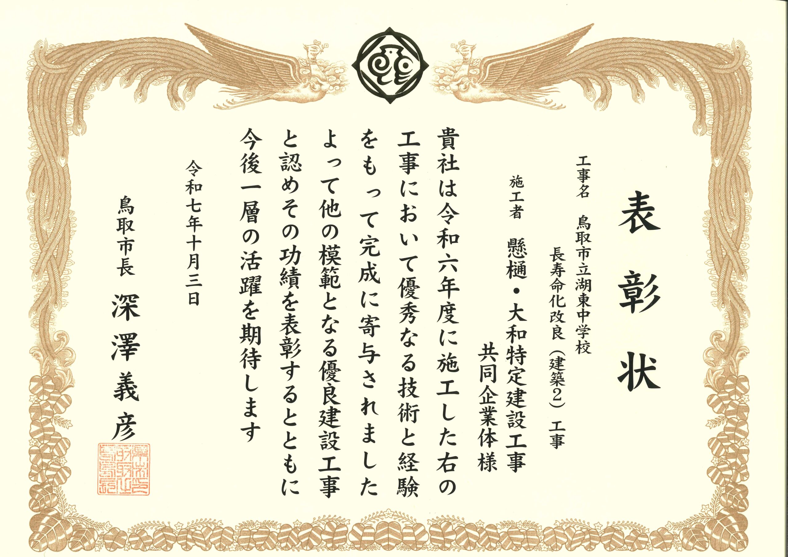 この度、懸樋・大和特定建設工事共同企業体は「鳥取市立湖東中学校長寿命化改良(建築2)工事」で、鳥取市優良建設工事表彰を受賞しました!
