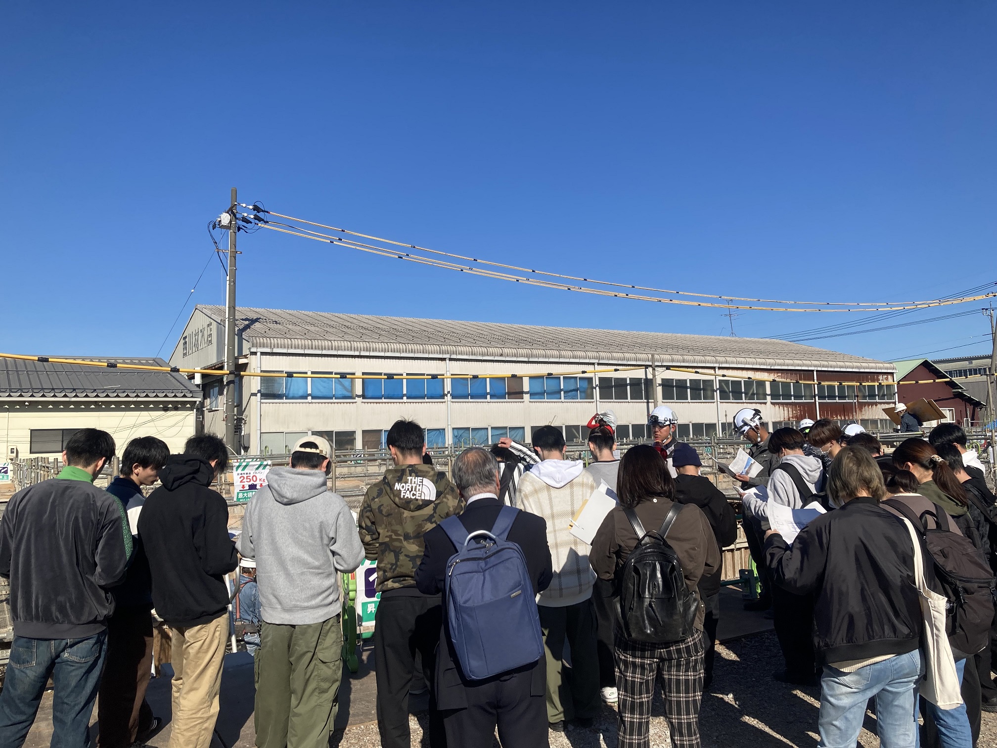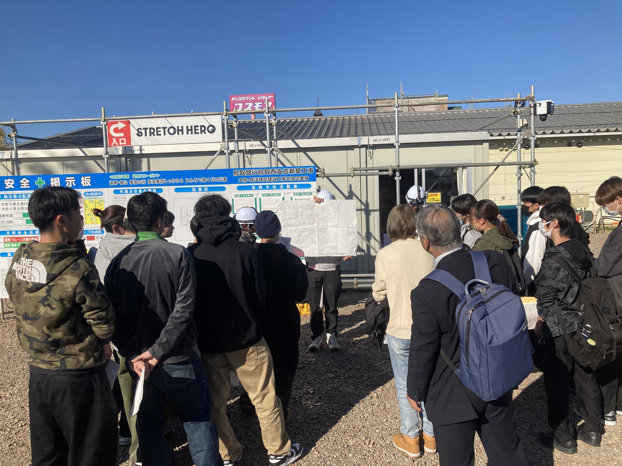 現場は基礎工事中でしたが、見学に来た学生と同年代の現場担当者が説明を行い、普段なかなか見ることができない工事現場を見学し、質問等が交わされました。